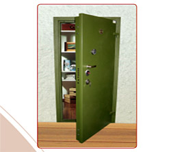 Chiusura affidata ad una serratura con codice in copiabile con chiave in triplice copia che aziona nr. 8 catenacci in acciaio diam. mm 20 più un catenaccio a scrocco, serratura di controllo (eventualmente omissibile) che aziona un catenaccio in acciaio diam. mm 20 e combinazione meccanica a 3 dischi.